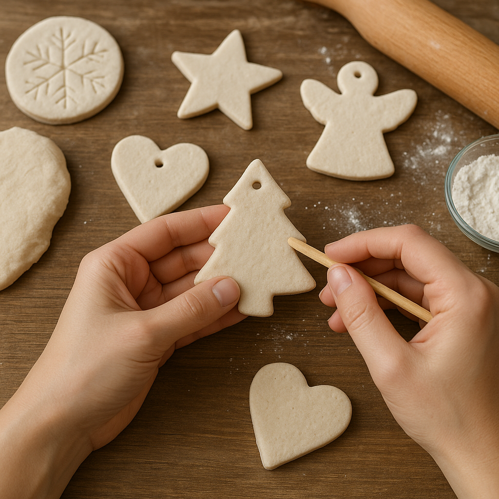 Po wyschnięciu lub wypieczeniu (60–90 minut w piekarniku nagrzanym do 100–120°C) ozdoby można ozdobić na różne sposoby: